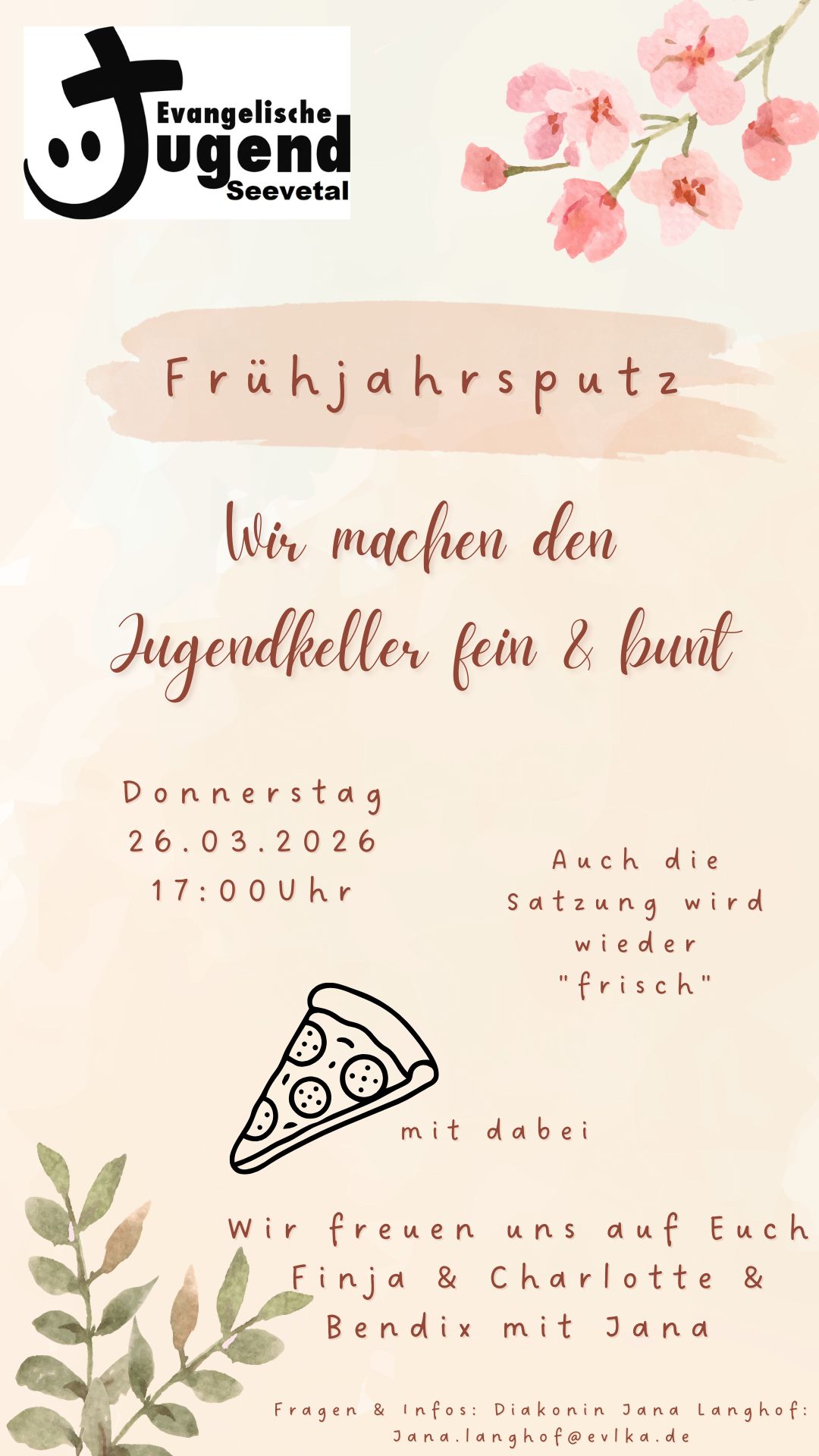 Bei Musik und mit einem leckeren Pizzaessen wollen wir fleißig den Jugendkeller Frühlingsfit machen. Auch unsere Satzung wird entstaubt 🙂
